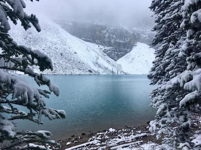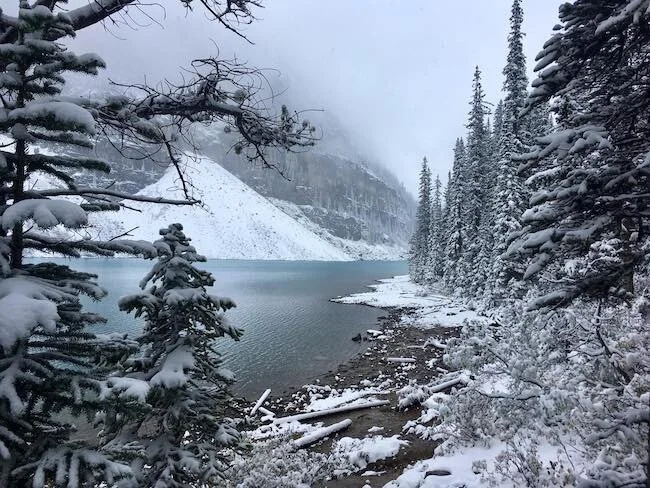 Sebbene il Canyon mi sia piaciuto molto, Banff è però celebre per i suoi Laghi dall’acqua turchese. Purtroppo hanno potuto dare solo il 60% della loro magnificenza. Sempre per colpa delle nubi che coprono i monti e del sole che non c’era. Ma lo spettacolo della neve che predomina su tutto è comunque valido. Soprattutto sulla strada un po’ accidentata per Jasper, dove le maestose cime delle montagne ricoprono almeno la metà del cielo. E i pini che segnano il tuo tragitto. Tutto bianco. Magico.