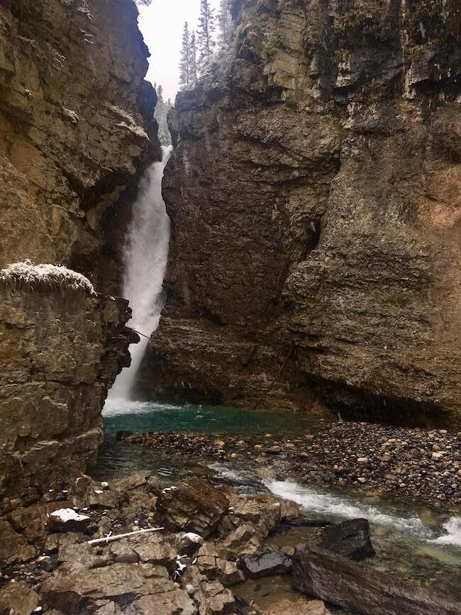 Decido perció che visto che non riesco a vedere bene in alto, meglio guardare nella direzione opposta, in basso. Per questo dedico il giusto tempo al Johnston Canyon. Per la prima volta cammino letteralmente dentro un canyon, lambendo le sponde di un fiume che genera delle bellissime cascate che vado a visitare con uno specifico trail in mezzo ai pini innevati. Intanto nevica nevica nevica.