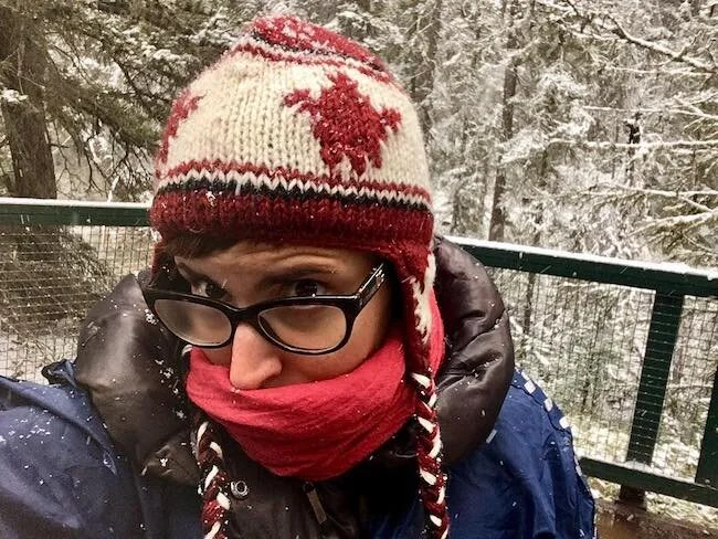 La Neve ha iniziato stanotte a imbiancare questa precisa parte del Canada, ossia il Banff e Jasper. Non smetterà di nevicare tutto il giorno. La mattina parto con una grossolana sfumatura di bianco. A sera è ovunque. È nel cielo. Sulle montagne. In terra. Sugli alberi. Nelle mie ossa. Benedico il giorno in cui ho deciso di portare con me k-way, piumino, maglia di lana, calzamaglia da infilare sotto i pantaloni e dr MartinS. Manca solo una cosa fondamentale: la cuffia. Ne acquisto una già a metà mattina, quella del Canada con le treccine. Sembro Pippi Calze Lunghe ma ha qualcosa che mi dona a differenza delle altre cuffie “a cappella”.