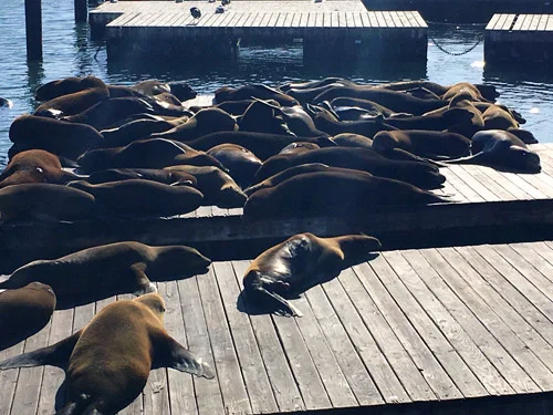 Secondo il mio parere, dovresti fare come me: passeggiare lungo il Fishermen’s Wharf e passare oltre alla svelta. L’unica cosa che merita davvero sono i leoni marini al Pier 39, che hanno ormai da tempo scelto liberamente di rilassarsi sugli attracchi del molo. Dal 1990, più di un migliaio di leoni marini, da gennaio a luglio soprattutto ma li trovi anche in altri periodi, sostano flemmatici sul Pier 39, motivo per cui è il più celebre, turistico affollato e trafficato molo di San Francisco.