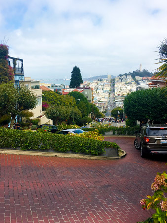 Nella mappa qui sopra ho segnato il punto esatto dal quale puoi meglio ammirare Lombard Street, la strada di San Francisco (e forse della California e di tutti gli Stati Uniti) più strana che esista. Grazie a Google Maps e alla mia personale esperienza, ti consiglio di vedere Lombard Street dapprima da Leavenworth Street, per poi percorrerla a piedi in salita di modo da ammirarla da vicino (ci vogliono dei bei polmoni e i glutei allenati). Una volta raggiunta la cima, ti troverai in Hyde Street. Leavenworth Street è l’incrocio nel quale ha termine la sezione di Lombard Street più famosa, quella appunto composta da mini-curve a zig-zag. Sembra come uno scenario da cartone animato.